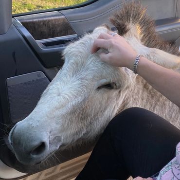 Shy Ann is an orphan. A Cotentin-Andalusian crossbreed donkey who came to us under the most heartbreaking of circumstances — her parent donkeys tragically perished in the extreme Texas heat after being left without access to water for nearly a week. The loss that preceded her arrival here is almost too painful to put into words, and yet out of that tragedy came this sweet, beautiful girl who needed a home and a family more than anyone can imagine. True to her name, she is very shy, but finding her way, one quiet day at a time. She watches the other donkeys in our herd eagerly seek out love, attention, and treats with wide, curious eyes — and is gathering the courage to do the same. She is young and full of life, and the lonely orphan who came to us is becoming something else — a cherished member of a full and loving family. The only life ahead of Shy Ann now is one filled with gentle hands, good food, and abundant love. She is truly a sweet and beautiful girl, and she is exactly where she was always meant to be.