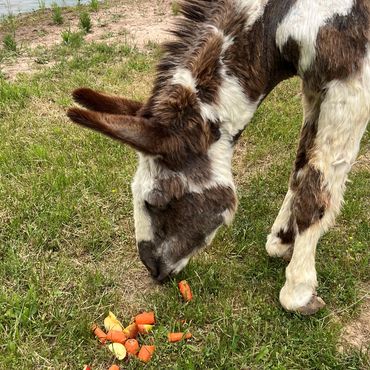 Henrietta is an American Spotted donkey with a story that goes straight to the heart. When we first noticed her severely clubbed front hooves — a congenital condition she had lived with her entire life — we approached her owners about seeking veterinary care. Their response? "We want you to keep her." So we did, without hesitation. An equine specialist determined that at over forty years old, corrective procedures would likely do more harm than good, and so we made a commitment to keep her comfortable, loved, and well cared for every single day she has left. That means pain medication, quality feed and hay, and a steady supply of her beloved carrots, along with something no veterinarian can prescribe but every animal at Butterfly Ranch receives in abundance: unconditional love. Henrietta has repaid that commitment tenfold and then some. She is wonderfully, gloriously vocal — never shy about striking up a conversation with anyone willing to listen, which around here happens to be anyone and everyone who will listen.
