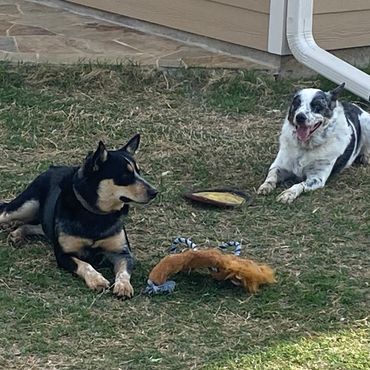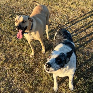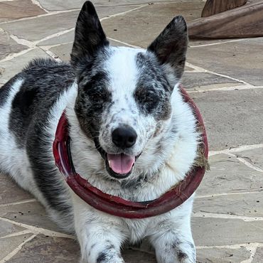 Benny is an Australian Cattle Dog — a heeler — with a story that is entirely his own. One evening, out of nowhere, he simply appeared at the ranch, fell into step alongside our other dogs, and walked right into our home, as if he had always been here and we just hadn't noticed yet. Whether he was lost or abandoned, we may never know. What we do know is that Benny chose us — which means in the truest sense of the word, he rescued us, not the other way around. With no microchip to trace his past, we stepped in with the veterinary care he needed and officially welcomed him into the family, which he had already joined on his own terms. Benny's favorite pursuits are frisbee and conversation — and make no mistake, this boy has a lot to say, loudly and very enthusiastically. His personality is boundless and his energy is seemingly inexhaustible. As for the cattle dog part of his heritage — well, Benny is indeed a nipper, and we are working on it. Time will tell, and we have a feeling Benny is going to be just fine.